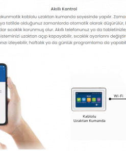 Sistemin gelişmiş kontrolü, LED ekranlı dokunmatik kablolu uzaktan kumanda sayesinde yapılır. Zaman ayarı saatlik veya günlük olarak yapılabilir. Bu şekilde sıcaklık geceleri veya tatilde olduğunuz zamanlarda otomatik olarak düşürülür, böylelikle uyandığınızda veya eve geri döndüğünüzde rahat hissedeceğiniz kadar sıcaklık korunmuş olur. Akıllı telefonunuz ya da tabletinizle, nerede olursanız olun tüm kontrol sizde. Mobil uygulamayı telefonunuza indirip, sisteminizi uzaktan açıp kapayabilir, sıcaklık ayarlarını değiştirebilir ya da tatil moduna alabilirsiniz. Uygulama üzerinden, enerji harcamalarınızı izleyebilir, haftalık ya da günlük programlama da yapabilirsiniz. Evde veya dışarıda, konfor hep sizinle.